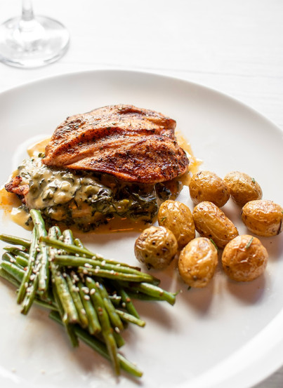 * Plato fuerte: Pechuga de Pollo Rellena, rellena con queso cheddar y espinacas, terminada al horno